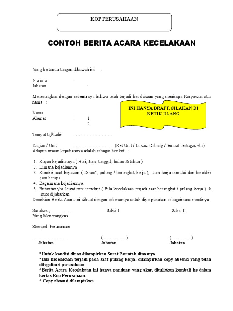 Contoh berita acara kronologis kecelakaan kerja untuk klaim.